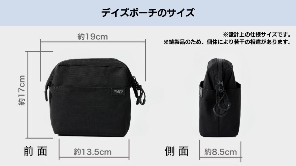 外寸:約17cm × 19cm × 厚さ8.5cm。手のひらサイズながら、ケーブルやバッテリー、充電器などのガジェット類をしっかり収納。