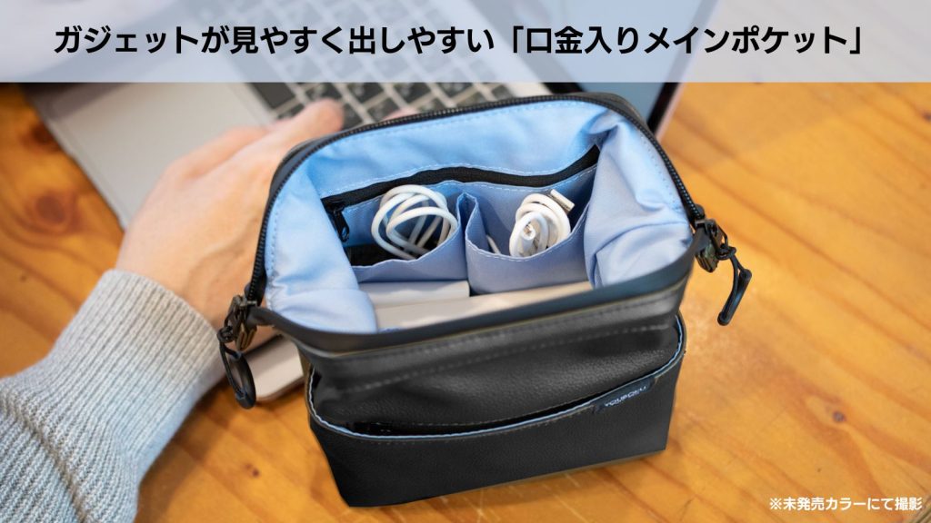 一般的なガジェットポーチと異なり、大きく開くがま口式を採用。